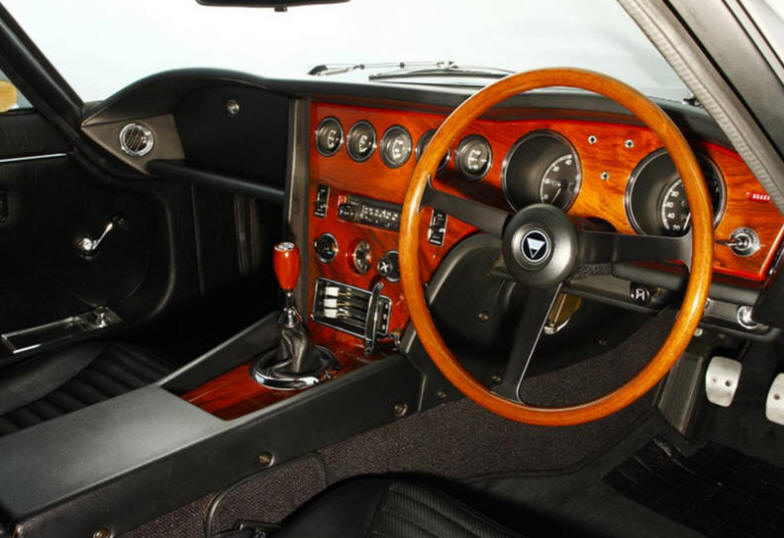 Inside, the car was as sporty as outside. The dashboard with its rosewood instrument panel, featured an impressive, long row of seven gauges - with more below. The wood-rim steering wheel and gearshift knob added to the classic sporty feel.