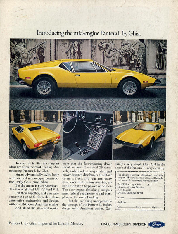 In 1972 the hotter GTS was added, with bigger wheelarches covering wider wheels and more power. 1972 saw the introduction of the Pantera L, primarily to suit American regulations, with big bumpers and a 'strangled' engine producing less power.